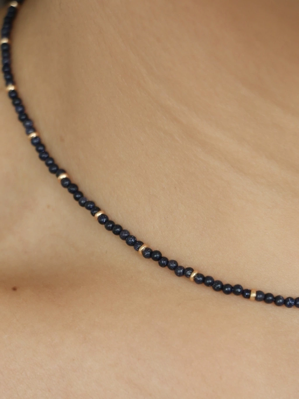 Colar produzido artesanalmente com miçangas de pedras sintética, fio de nylon reforçado e acabamentos em banho de ouro18k.