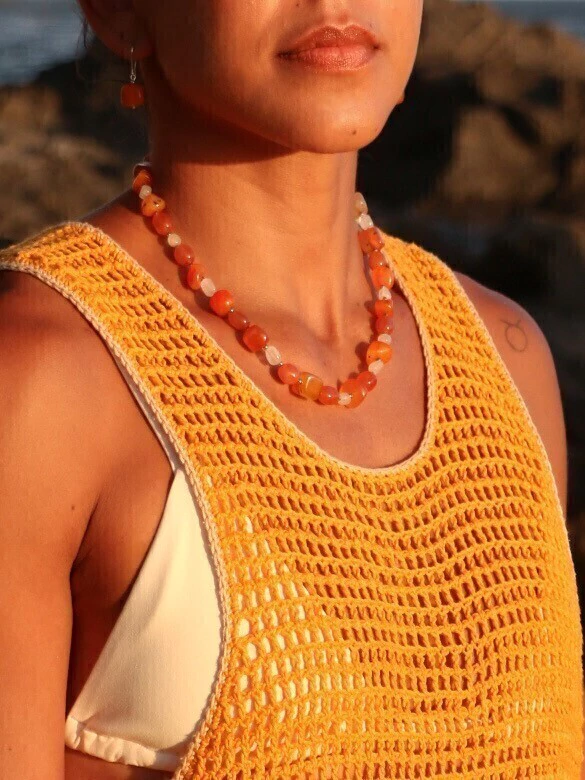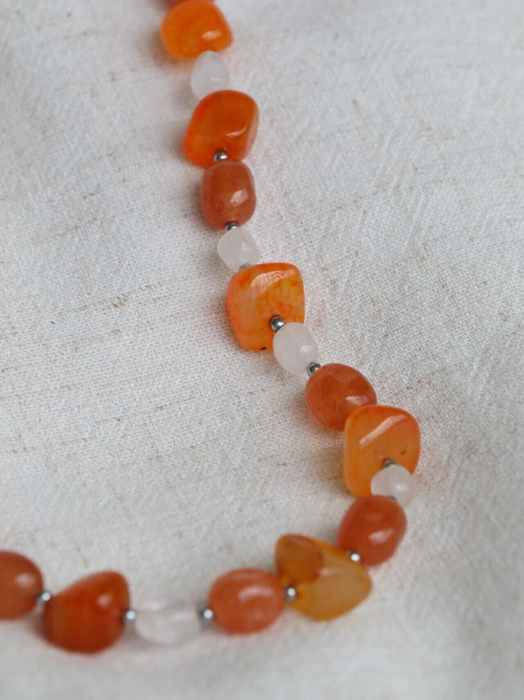 O Colar Solar Maxi é pura luminosidade. Feito com ágatas laranja roladas, ele traz um visual marcante, vivo e cheio de movimento. Cada pedra tem sua própria forma, criando um efeito orgânico e imponente que se destaca no colo. Os separadores de hematita adicionam contraste metálico e elegância, equilibrando a intensidade do laranja com um toque de sofisticação. É uma peça poderosa para quem ama acessórios maxi com presença verdadeira.