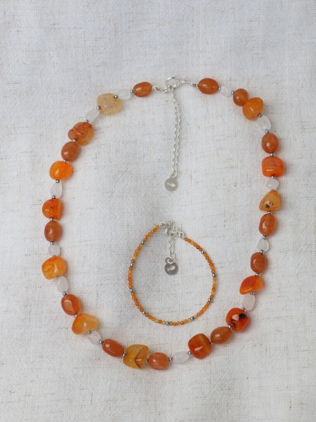 A Pulseira Solar é um amuleto de energia quente e brilho natural. Feita em ágata de fogo facetada, ela traz aquele cintilar intenso que lembra o calor do sol no auge, viva, vibrante e cheia de movimento. Os separadores de hematita prata adicionam equilíbrio e sofisticação, criando uma peça que irradia força sem perder a delicadeza. Um acessório para quem quer iluminar a própria presença todos os dias.